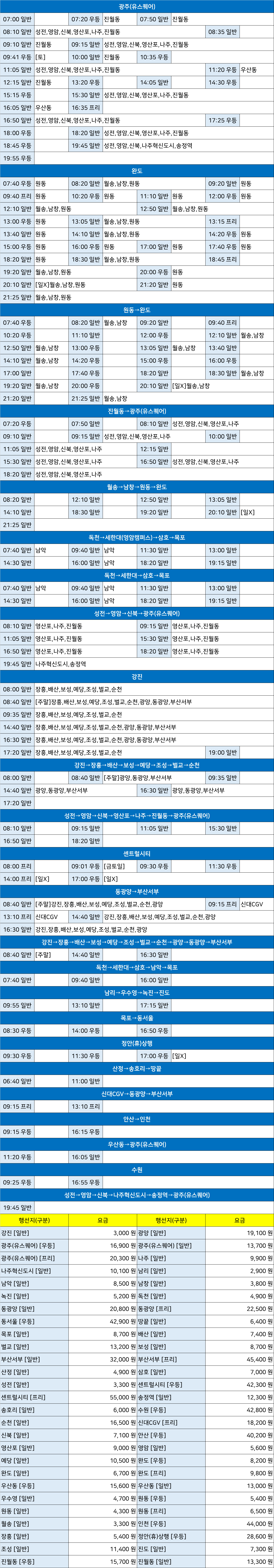 해남 시외버스 터미널 시간표/요금표 2025년 03월 22일 기준