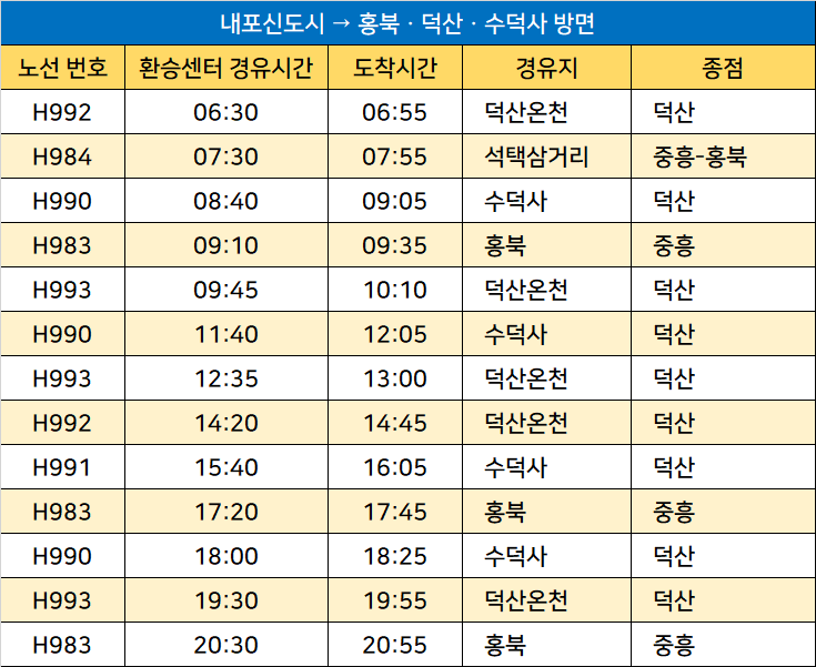 내포신도시 → 홍북ㆍ덕산ㆍ수덕사 방면 노선정보: 덕산, 덕산온천, 석택삼거리, 수덕사, 중흥, 홍북
