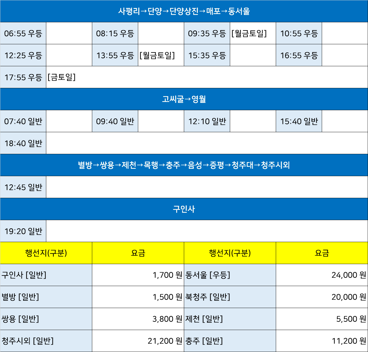 영춘시외고속버스정류장 영춘정류소 영춘터미널 → "고씨굴→영월,구인사,별방→쌍용→제천→목행→충주→음성→증평→청주대→청주시외,사평리→단양→단양상진→매포→동서울".