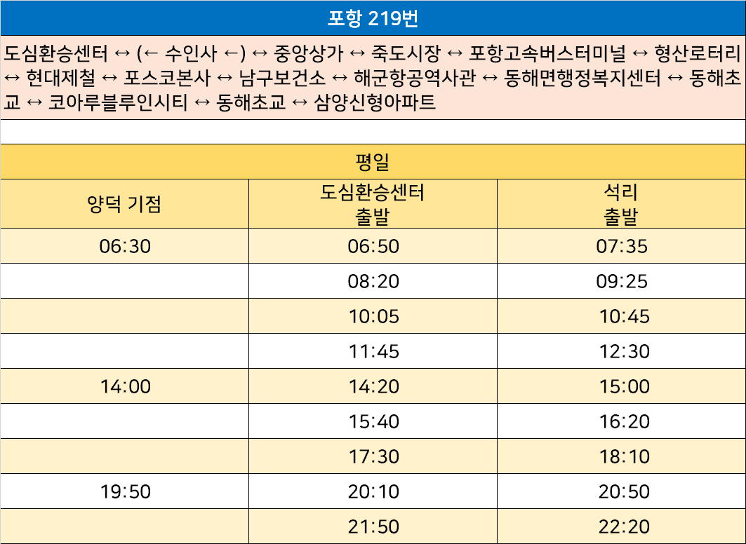 포항 219번: 도심환승센터 ↔ (← 수인사 ←) ↔ 중앙상가 ↔ 죽도시장 ↔ 포항고속버스터미널 ↔ 형산로터리 ↔ 현대제철 ↔ 포스코본사 ↔ 남구보건소 ↔ 해군항공역사관 ↔ 동해면행정복지센터 ↔ 동해초교 ↔ 코아루블루인시티 ↔ 동해초교 ↔ 삼양신형아파트
