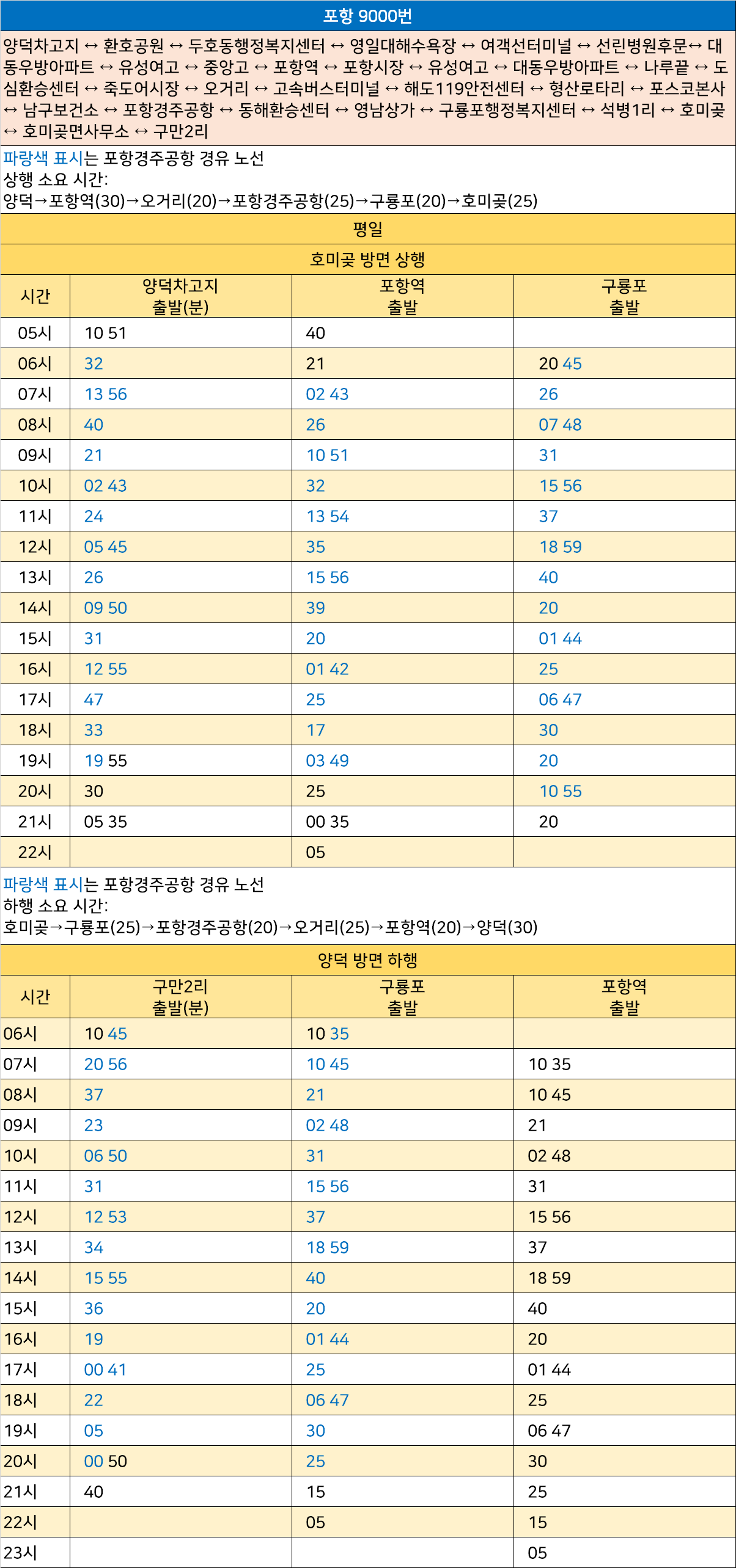 포항 9000번: 양덕차고지 ↔ 환호공원 ↔ 두호동행정복지센터 ↔ 영일대해수욕장 ↔ 여객선터미널 ↔ 선린병원후문↔ 대동우방아파트 ↔ 유성여고 ↔ 중앙고 ↔ 포항역 ↔ 포항시장 ↔ 유성여고 ↔ 대동우방아파트 ↔ 나루끝 ↔ 도심환승센터 ↔ 죽도어시장 ↔ 오거리 ↔ 고속버스터미널 ↔ 해도119안전센터 ↔ 형산로타리 ↔ 포스코본사 ↔ 남구보건소 ↔ 포항경주공항 ↔ 동해환승센터 ↔ 영남상가 ↔ 구룡포행정복지센터 ↔ 석병1리 ↔ 호미곶 ↔ 호미곶면사무소 ↔ 구만2리