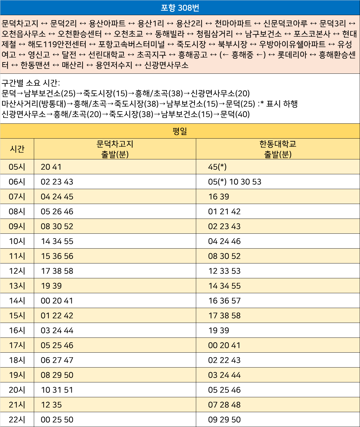 포항 308번: 문덕차고지 ↔ 문덕2리 ↔ 용산아파트 ↔ 용산1리 ↔ 용산2리 ↔ 천마아파트 ↔ 신문덕코아루 ↔ 문덕3리 ↔ 오천읍사무소 ↔ 오천환승센터 ↔ 오천초교 ↔ 동해빌라 ↔ 청림삼거리 ↔ 남구보건소 ↔ 포스코본사 ↔ 현대제철 ↔ 해도119안전센터 ↔ 포항고속버스터미널 ↔ 죽도시장 ↔ 북부시장 ↔ 우방아이유쉘아파트 ↔ 유성여고 ↔ 영신고 ↔ 달전 ↔ 선린대학교 ↔ 초곡지구 ↔ 흥해공고 ↔ (← 흥해중 ←) ↔ 롯데리아 ↔ 흥해환승센터 ↔ 한동맨션 ↔ 매산리 ↔ 용연저수지 ↔ 신광면사무소