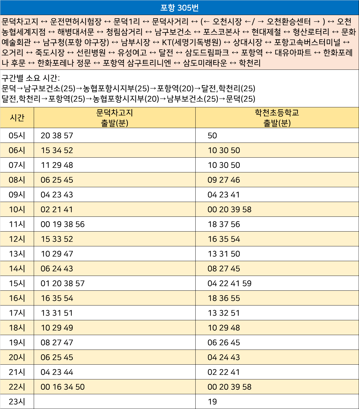 포항 305번: 문덕차고지 ↔ 운전면허시험장 ↔ 문덕1리 ↔ 문덕사거리 ↔ (← 오천시장 ←/ → 오천환승센터 → ) ↔ 오천농협세계지점 ↔ 해병대서문 ↔ 청림삼거리 ↔ 남구보건소 ↔ 포스코본사 ↔ 현대제철 ↔ 형산로터리 ↔ 문화예술회관 ↔ 남구청(포항 야구장) ↔ 남부시장 ↔ KT(세명기독병원) ↔ 상대시장 ↔ 포항고속버스터미널 ↔ 오거리 ↔ 죽도시장 ↔ 선린병원 ↔ 유성여고 ↔ 달전 ↔ 삼도드림파크 ↔ 포항역 ↔ 대유아파트 ↔ 한화포레나 후문 ↔ 한화포레나 정문 ↔ 포항역 삼구트리니엔 ↔ 삼도미래타운 ↔ 학천리