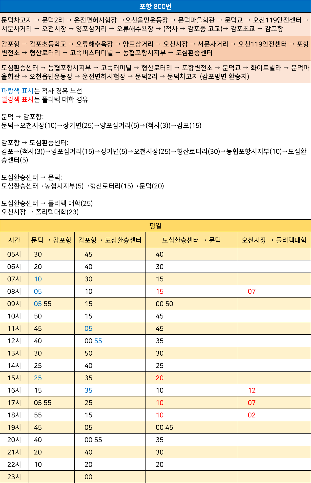 포항 800번: 문덕차고지 → 문덕2리 → 운전면허시험장 →오천읍민운동장 → 문덕마을회관 → 문덕교 → 오천119안전센터 → 서문사거리 → 오천시장 → 양포삼거리 → 오류해수욕장 → (척사 → 감포중.고교)→ 감포초교 → 감포항 → 감포초등학교 → 오류해수욕장 → 양포삼거리 → 오천시장 → 서문사거리 → 오천119안전센터 → 포항변전소 → 형산로터리 → 고속버스터미널 → 농협포항시지부 → 도심환승센터 → 농협포항시지부 → 고속터미널 → 형산로터리 → 포항변전소 → 문덕교 → 화이트빌라 → 문덕마을회관 → 오천읍민운동장 → 운전면허시험장 → 문덕2리 → 문덕차고지 (감포방면 환승지)