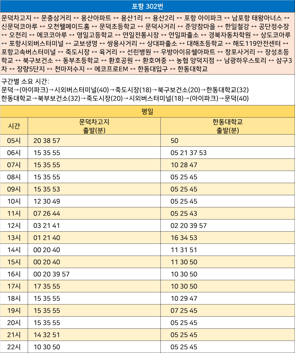 포항 302번: 문덕차고지 ↔ 문충삼거리 ↔ 용산아파트 ↔ 용산1리 ↔ 용산2리 ↔ 포항 아이파크 ↔ 남포항 태왕아너스 ↔ 신문덕코아루 ↔ 오천웰메이드홈 ↔ 문덕초등학교 ↔ 문덕사거리 ↔ 준양참마을 ↔ 한일철강 ↔ 공단정수장 ↔ 오천리 ↔ 에코코아루 ↔ 영일고등학교 ↔ 연일전통시장 ↔ 연일파출소 ↔ 경북자동차학원 ↔ 상도코아루 ↔ 포항시외버스터미널 ↔ 교보생명 ↔ 쌍용사거리 ↔ 상대파출소 ↔ 대해초등학교 ↔ 해도119안전센터 ↔ 포항고속버스터미널 ↔ 죽도시장 ↔ 육거리 ↔ 선린병원 ↔ 우방아이유쉘아파트 ↔ 창포사거리 ↔ 장성초등학교 ↔ 북구보건소 ↔ 동부초등학교 ↔ 환호공원 ↔ 환호여중 ↔ 농협 양덕지점 ↔ 남광하우스토리 ↔ 삼구3차 ↔ 장량5단지 ↔ 천마저수지 ↔ 에코프로EM ↔ 한동대입구 ↔ 한동대학교
