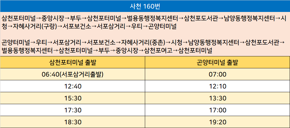 사천 160번: 삼천포터미널→중앙시장→부두→삼천포터미널→벌용동행정복지센터→삼천포도서관→남양동행정복지센터→시청→자혜사거리(구랑)→서포보건소→서포삼거리→우티→곤양터미널 / 곤양터미널→우티→서포삼거리→서포보건소→자혜사거리(중촌)→시청→남양동행정복지센터→삼천포도서관→벌용동행정복지센터→삼천포터미널→부두→중앙시장→삼천포여고→삼천포터미널