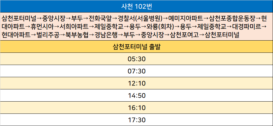 사천 102번: 삼천포터미널→중앙시장→부두→전화국앞→경찰서(서울병원)→예미지아파트→삼천포종합운동장→현대아파트→휴먼시아→서희아파트→제일중학교→용두→와룡(회차)→용두→제일중학교→대경파미르→현대아파트→벌리주공→북부농협→경남은행→부두→중앙시장→삼천포여고→삼천포터미널
