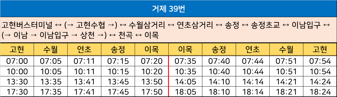 거제 39번: 고현버스터미널 ↔ (→ 고현수협 →) ↔ 수월삼거리 ↔ 연초삼거리 ↔ 송정 ↔ 송정초교 ↔ 이남입구 ↔ (→ 이남 → 이남입구 → 상천 →) ↔ 천곡 ↔ 이목