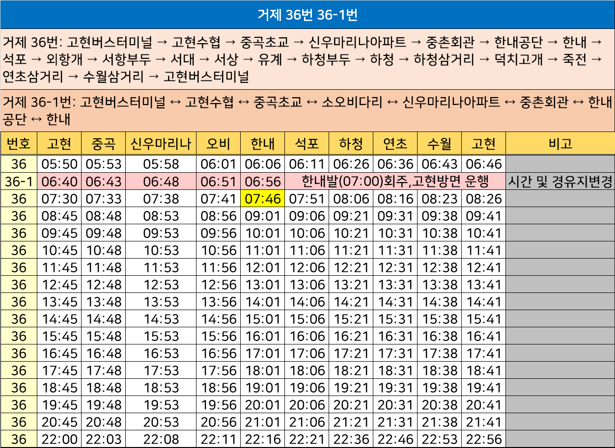 거제 36-1번: 고현버스터미널 ↔ 고현수협 ↔ 중곡초교 ↔ 소오비다리 ↔ 신우마리나아파트 ↔ 중촌회관 ↔ 한내공단 ↔ 한내