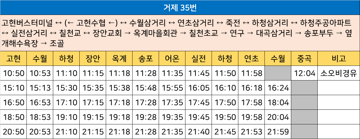 거제 35번: 고현버스터미널 ↔ (← 고현수협 ←) ↔ 수월삼거리 ↔ 연초삼거리 ↔ 죽전 ↔ 하청삼거리 ↔ 하청주공아파트 ↔ 실전삼거리 ↔ 칠천교 ↔ 장안교회 → 옥계마을회관 → 칠천초교 → 연구 → 대곡삼거리 → 송포부두 → 옆개해수욕장 → 조골