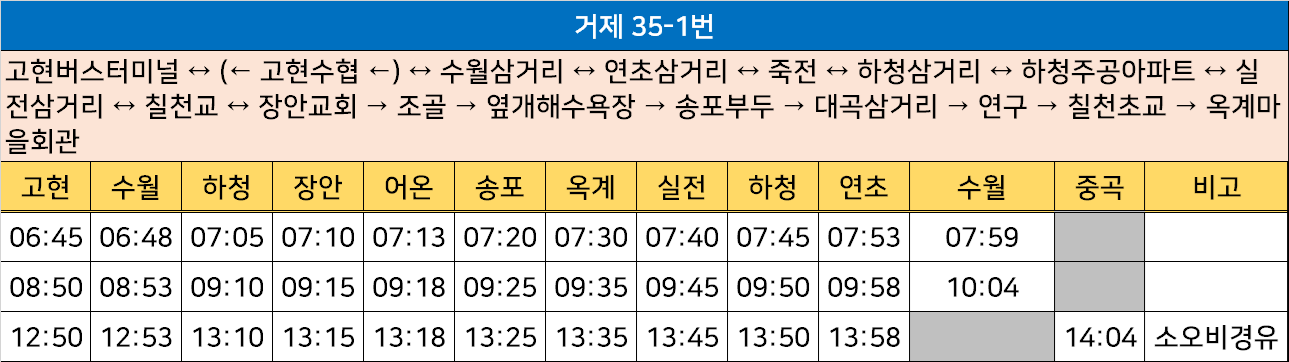 거제 35-1번: 고현버스터미널 ↔ (← 고현수협 ←) ↔ 수월삼거리 ↔ 연초삼거리 ↔ 죽전 ↔ 하청삼거리 ↔ 하청주공아파트 ↔ 실전삼거리 ↔ 칠천교 ↔ 장안교회 → 조골 → 옆개해수욕장 → 송포부두 → 대곡삼거리 → 연구 → 칠천초교 → 옥계마을회관