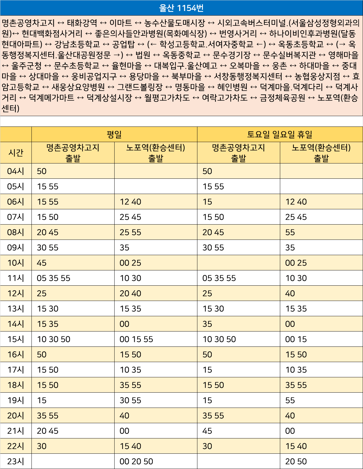 울산 1154번: 명촌공영차고지 ↔ 태화강역 ↔ 이마트 ↔ 농수산물도매시장 ↔ 시외고속버스터미널.(서울삼성정형외과의원)↔ 현대백화점사거리 ↔ 좋은의사들안과병원(목화예식장) ↔ 번영사거리 ↔ 하나이비인후과병원(달동현대아파트) ↔ 강남초등학교 ↔ 공업탑 ↔ (← 학성고등학교.서여자중학교 ←) ↔ 옥동초등학교 ↔ (→ 옥동행정복지센터.울산대공원정문 →) ↔ 법원 ↔ 옥동중학교 ↔ 문수경기장 ↔ 문수실버복지관 ↔ 영해마을 ↔ 울주군청 ↔ 문수초등학교 ↔ 율현마을 ↔ 대복입구.울산예고 ↔ 오복마을 ↔ 웅촌 ↔ 하대마을 ↔ 중대마을 ↔ 상대마을 ↔ 웅비공업지구 ↔ 용당마을 ↔ 북부마을 ↔ 서창동행정복지센터 ↔ 농협웅상지점 ↔ 효암고등학교 ↔ 새웅상요양병원 ↔ 그랜드볼링장 ↔ 명동마을 ↔ 혜인병원 ↔ 덕계마을.덕계다리 ↔ 덕계사거리 ↔ 덕계메가마트 ↔ 덕계상설시장 ↔ 월평고가차도 ↔ 여락고가차도 ↔ 금정체육공원 ↔ 노포역(환승센터)
