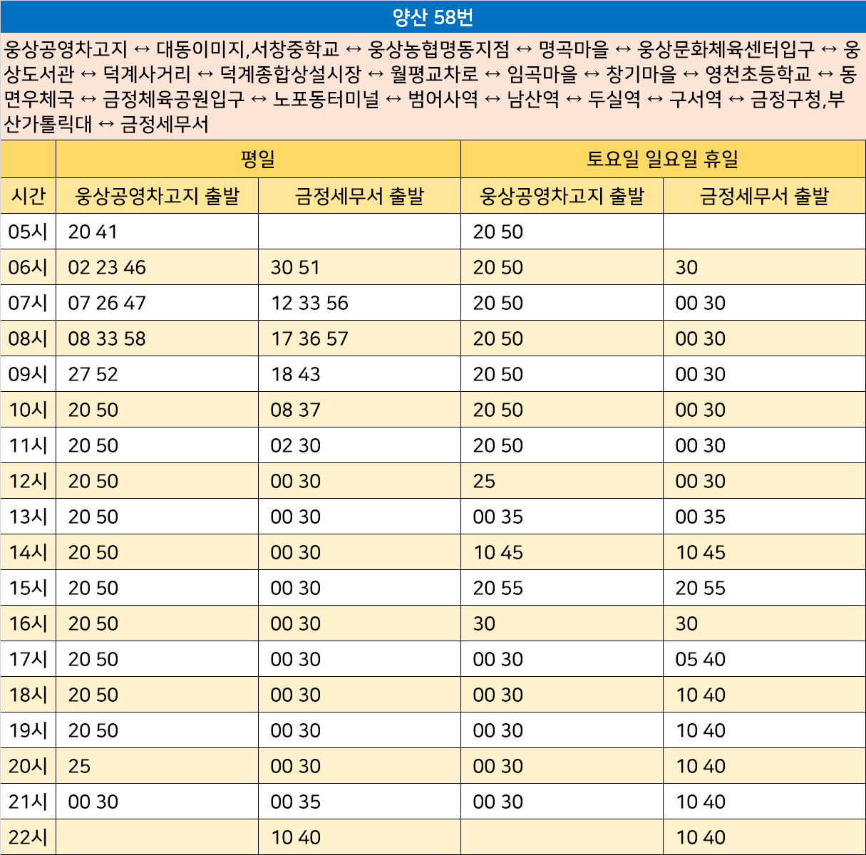 양산 58번: 웅상공영차고지 ↔ 대동이미지,서창중학교 ↔ 웅상농협명동지점 ↔ 명곡마을 ↔ 웅상문화체육센터입구 ↔ 웅상도서관 ↔ 덕계사거리 ↔ 덕계종합상설시장 ↔ 월평교차로 ↔ 임곡마을 ↔ 창기마을 ↔ 영천초등학교 ↔ 동면우체국 ↔ 금정체육공원입구 ↔ 노포동터미널 ↔ 범어사역 ↔ 남산역 ↔ 두실역 ↔ 구서역 ↔ 금정구청,부산가톨릭대 ↔ 금정세무서