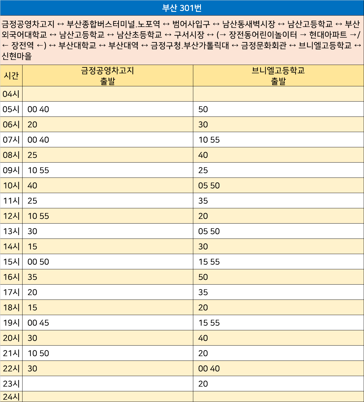 부산 301번: 금정공영차고지 ↔ 부산종합버스터미널.노포역 ↔ 범어사입구 ↔ 남산동새벽시장 ↔ 남산고등학교 ↔ 부산외국어대학교 ↔ 남산고등학교 ↔ 남산초등학교 ↔ 구서시장 ↔ (→ 장전동어린이놀이터 → 현대아파트 →/← 장전역 ←) ↔ 부산대학교 ↔ 부산대역 ↔ 금정구청.부산가톨릭대 ↔ 금정문화회관 ↔ 브니엘고등학교 ↔ 신현마을