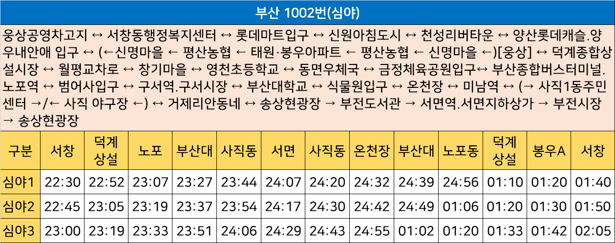 부산 1002번(심야): 웅상공영차고지 ↔ 서창동행정복지센터 ↔ 롯데마트입구 ↔ 신원아침도시 ↔ 천성리버타운 ↔ 양산롯데캐슬.양우내안애 입구 ↔ (←신명마을 ← 평산농협 ← 태원·봉우아파트 ← 평산농협 ← 신명마을 ←)[웅상] ↔ 덕계종합상설시장 ↔ 월평교차로 ↔ 창기마을 ↔ 영천초등학교 ↔ 동면우체국 ↔ 금정체육공원입구↔ 부산종합버스터미널.노포역 ↔ 범어사입구 ↔ 구서역.구서시장 ↔ 부산대학교 ↔ 식물원입구 ↔ 온천장 ↔ 미남역 ↔ (→ 사직1동주민센터 →/← 사직 야구장 ←) ↔ 거제리안동네 ↔ 송상현광장 → 부전도서관 → 서면역.서면지하상가 → 부전시장 → 송상현광장