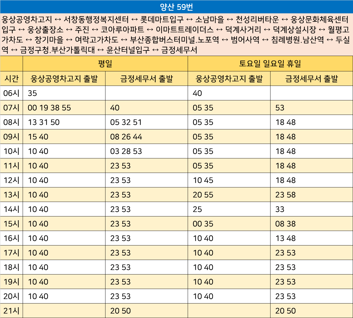 양산 59번: 웅상공영차고지 ↔ 서창동행정복지센터 ↔ 롯데마트입구 ↔ 소남마을 ↔ 천성리버타운 ↔ 웅상문화체육센터입구 ↔ 웅상출장소 ↔ 주진 ↔ 코아루아파트 ↔ 이마트트레이더스 ↔ 덕계사거리 ↔ 덕계상설시장 ↔ 월평고가차도 ↔ 창기마을 ↔ 여락고가차도 ↔ 부산종합버스터미널.노포역 ↔ 범어사역 ↔ 침례병원.남산역 ↔ 두실역 ↔ 금정구청.부산가톨릭대 ↔ 윤산터널입구 ↔ 금정세무서