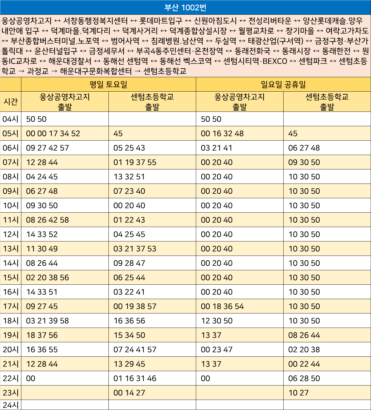 부산 1002번: 웅상공영차고지 ↔ 서창동행정복지센터 ↔ 롯데마트입구 ↔ 신원아침도시 ↔ 천성리버타운 ↔ 양산롯데캐슬.양우내안애 입구 ↔ 덕계마을.덕계다리 ↔ 덕계사거리 ↔ 덕계종합상설시장 ↔ 월평교차로 ↔ 창기마을 ↔ 여락고가차도 ↔ 부산종합버스터미널.노포역 ↔ 범어사역 ↔ 침례병원.남산역 ↔ 두실역 ↔ 태광산업(구서역) ↔ 금정구청·부산가톨릭대 ↔ 윤산터널입구 ↔ 금정세무서 ↔ 부곡4동주민센터·온천장역 ↔ 동래전화국 ↔ 동래시장 ↔ 동래한전 ↔ 원동IC교차로 ↔ 해운대경찰서 ↔ 동해선 센텀역 ↔ 동해선 벡스코역 ↔ 센텀시티역·BEXCO ↔ 센텀파크 ↔ 센텀초등학교 → 과정교 → 해운대구문화복합센터 → 센텀초등학교