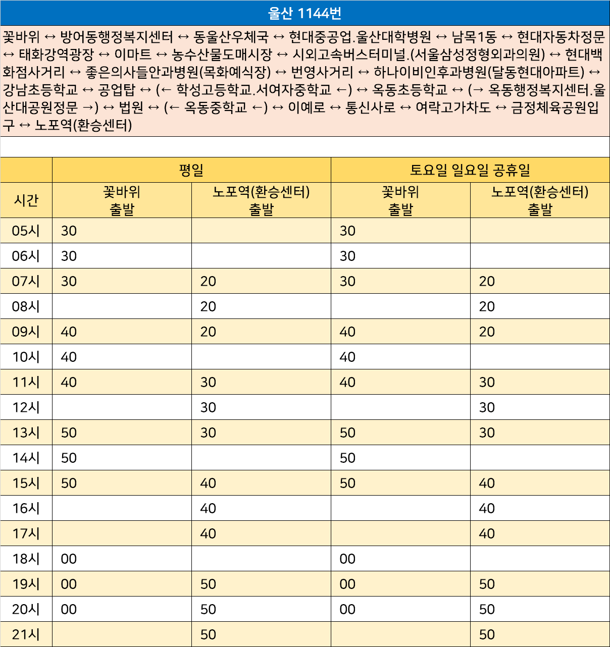 울산 1144번: 꽃바위 ↔ 방어동행정복지센터 ↔ 동울산우체국 ↔ 현대중공업.울산대학병원 ↔ 남목1동 ↔ 현대자동차정문 ↔ 태화강역광장 ↔ 이마트 ↔ 농수산물도매시장 ↔ 시외고속버스터미널.(서울삼성정형외과의원) ↔ 현대백화점사거리 ↔ 좋은의사들안과병원(목화예식장) ↔ 번영사거리 ↔ 하나이비인후과병원(달동현대아파트) ↔ 강남초등학교 ↔ 공업탑 ↔ (← 학성고등학교.서여자중학교 ←) ↔ 옥동초등학교 ↔ (→ 옥동행정복지센터.울산대공원정문 →) ↔ 법원 ↔ (← 옥동중학교 ←) ↔ 이예로 ↔ 통신사로 ↔ 여락고가차도 ↔ 금정체육공원입구 ↔ 노포역(환승센터)