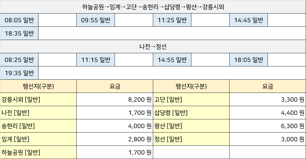 여량공영시외고속버스터미널 여량정류장 여량정류소 → "나전→정선,하늘공원→임계→고단→송현리→삽당령→왕산→강릉시외".