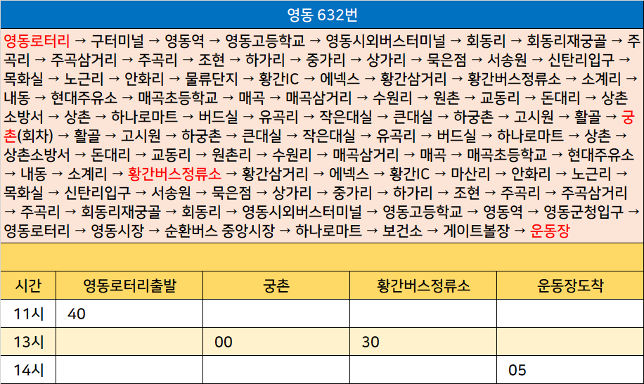 영동 632번: 영동로터리 → 구터미널 → 영동역 → 영동고등학교 → 영동시외버스터미널 → 회동리 → 회동리재궁골 → 주곡리 → 주곡삼거리 → 주곡리 → 조현 → 하가리 → 중가리 → 상가리 → 묵은점 → 서송원 → 신탄리입구 → 목화실 → 노근리 → 안화리 → 물류단지 → 황간IC → 에넥스 → 황간삼거리 → 황간버스정류소 → 소계리 → 내동 → 현대주유소 → 매곡초등학교 → 매곡 → 매곡삼거리 → 수원리 → 원촌 → 교동리 → 돈대리 → 상촌소방서 → 상촌 → 하나로마트 → 버드실 → 유곡리 → 작은대실 → 큰대실 → 하궁촌 → 고시원 → 활골 → 궁촌(회차) → 활골 → 고시원 → 하궁촌 → 큰대실 → 작은대실 → 유곡리 → 버드실 → 하나로마트 → 상촌 → 상촌소방서 → 돈대리 → 교동리 → 원촌리 → 수원리 → 매곡삼거리 → 매곡 → 매곡초등학교 → 현대주유소 → 내동 → 소계리 → 황간버스정류소 → 황간삼거리 → 에넥스 → 황간IC → 마산리 → 안화리 → 노근리 → 목화실 → 신탄리입구 → 서송원 → 묵은점 → 상가리 → 중가리 → 하가리 → 조현 → 주곡리 → 주곡삼거리 → 주곡리 → 회동리재궁골 → 회동리 → 영동시외버스터미널 → 영동고등학교 → 영동역 → 영동군청입구 → 영동로터리 → 영동시장 → 순환버스 중앙시장 → 하나로마트 → 보건소 → 게이트볼장 → 운동장