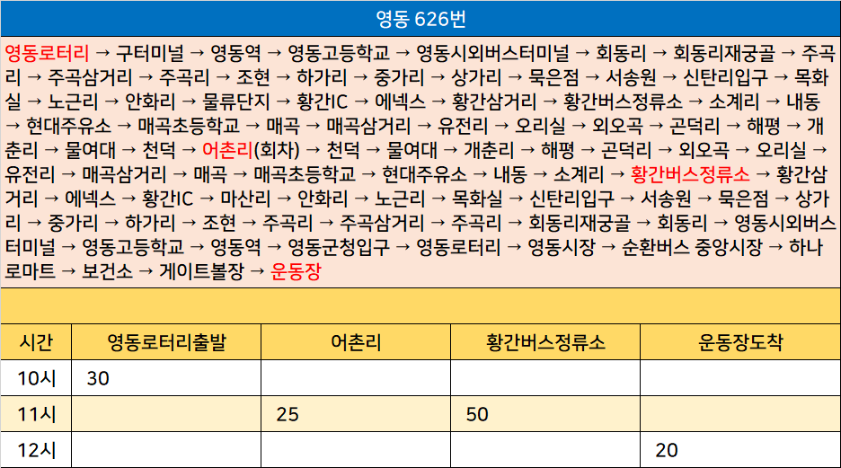 영동 626번: 영동로터리 → 구터미널 → 영동역 → 영동고등학교 → 영동시외버스터미널 → 회동리 → 회동리재궁골 → 주곡리 → 주곡삼거리 → 주곡리 → 조현 → 하가리 → 중가리 → 상가리 → 묵은점 → 서송원 → 신탄리입구 → 목화실 → 노근리 → 안화리 → 물류단지 → 황간IC → 에넥스 → 황간삼거리 → 황간버스정류소 → 소계리 → 내동 → 현대주유소 → 매곡초등학교 → 매곡 → 매곡삼거리 → 유전리 → 오리실 → 외오곡 → 곤덕리 → 해평 → 개춘리 → 물여대 → 천덕 → 어촌리(회차) → 천덕 → 물여대 → 개춘리 → 해평 → 곤덕리 → 외오곡 → 오리실 → 유전리 → 매곡삼거리 → 매곡 → 매곡초등학교 → 현대주유소 → 내동 → 소계리 → 황간버스정류소 → 황간삼거리 → 에넥스 → 황간IC → 마산리 → 안화리 → 노근리 → 목화실 → 신탄리입구 → 서송원 → 묵은점 → 상가리 → 중가리 → 하가리 → 조현 → 주곡리 → 주곡삼거리 → 주곡리 → 회동리재궁골 → 회동리 → 영동시외버스터미널 → 영동고등학교 → 영동역 → 영동군청입구 → 영동로터리 → 영동시장 → 순환버스 중앙시장 → 하나로마트 → 보건소 → 게이트볼장 → 운동장