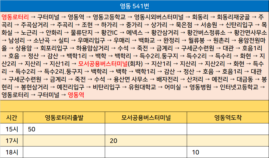 영동 541번: 영동로터리 → 구터미널 → 영동역 → 영동고등학교 → 영동시외버스터미널 → 회동리 → 회동리재궁골 → 주곡리 → 주곡삼거리 → 주곡리 → 조현 → 하가리 → 중가리 → 상가리 → 묵은점 → 서송원 → 신탄리입구 → 목화실 → 노근리 → 안화리 → 물류단지 → 황간IC → 에넥스 → 황간삼거리 → 황간버스정류소 → 황간면사무소 → 남성리 → 소난곡 → 실티 → 우매리입구 → 우매리 → 백화교 → 완정리 → 월류봉 → 원촌리 → 용암전원마을 → 상용암 → 회포리입구 → 하용암삼거리 → 수석 → 죽전 → 금계리 → 구세군수련원 → 대관 → 호음1리 → 호음 → 정산 → 감산 → 백학1리 → 백학 → 백학리 → 득수2리.둥구지 → 득수2리 → 득수리 → 화현 → 지산2리 → 지산리 → 지산1리 → 모서공용버스터미널(회차) → 지산1리 → 지산리 → 지산2리 → 화현 → 득수리 → 득수2리 → 득수2리.둥구지 → 백학리 → 백학 → 백학1리 → 감산 → 정산 → 호음 → 호음1리 → 대관 → 구세군수련원 → 금계리 → 죽전 → 수석 → 용산면 사무소 → 배자전리 → 산저리 → 예전리 → 대금동 → 봉현리 → 봉현삼거리 → 예전리입구 → 비탄리입구 → 유원대학교 → 어미실 → 영동병원 → 인터넷고등학교 → 영동로터리 → 구터미널 → 영동역