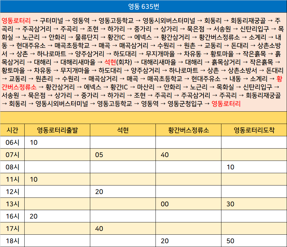 영동 635번: 영동로터리 → 구터미널 → 영동역 → 영동고등학교 → 영동시외버스터미널 → 회동리 → 회동리재궁골 → 주곡리 → 주곡삼거리 → 주곡리 → 조현 → 하가리 → 중가리 → 상가리 → 묵은점 → 서송원 → 신탄리입구 → 목화실 → 노근리 → 안화리 → 물류단지 → 황간IC → 에넥스 → 황간삼거리 → 황간버스정류소 → 소계리 → 내동 → 현대주유소 → 매곡초등학교 → 매곡 → 매곡삼거리 → 수원리 → 원촌 → 교동리 → 돈대리 → 상촌소방서 → 상촌 → 하나로마트 → 양주삼거리 → 하도대리 → 무지개마을 → 차유동 → 황토마을 → 작은흙목 → 흙목삼거리 → 대해리 → 대해리새마을 → 석현(회차) → 대해리새마을 → 대해리 → 흙목삼거리 → 작은흙목 → 황토마을 → 차유동 → 무지개마을 → 하도대리 → 양주삼거리 → 하나로마트 → 상촌 → 상촌소방서 → 돈대리 → 교동리 → 원촌리 → 수원리 → 매곡삼거리 → 매곡 → 매곡초등학교 → 현대주유소 → 내동 → 소계리 → 황간버스정류소 → 황간삼거리 → 에넥스 → 황간IC → 마산리 → 안화리 → 노근리 → 목화실 → 신탄리입구 → 서송원 → 묵은점 → 상가리 → 중가리 → 하가리 → 조현 → 주곡리 → 주곡삼거리 → 주곡리 → 회동리재궁골 → 회동리 → 영동시외버스터미널 → 영동고등학교 → 영동역 → 영동군청입구 → 영동로터리