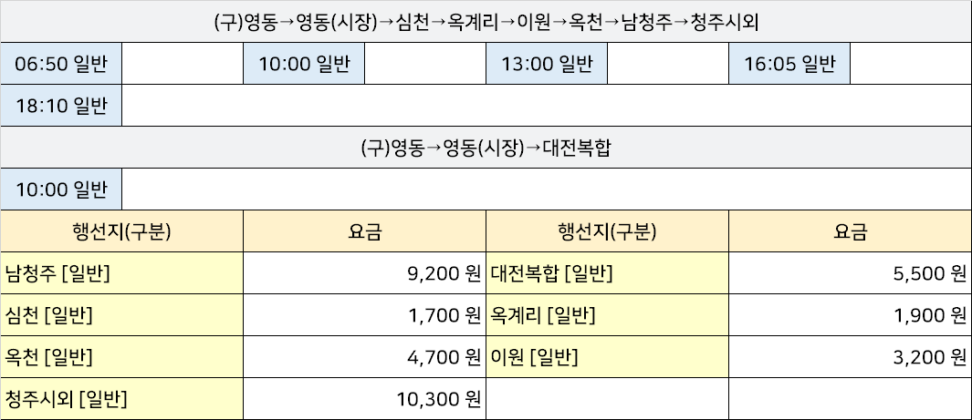 영동시외고속버스터미널 영동정류장 영동정류소 → "(구)영동→영동(시장)→대전,(구)영동→영동(시장)→심천→옥계리→이원→옥천→남청주→청주시외".