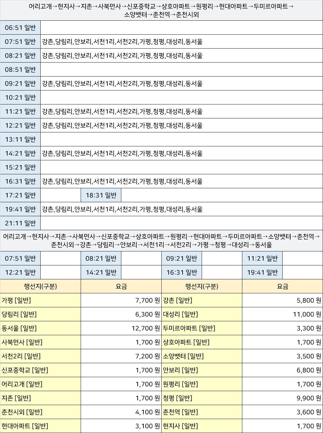 서오지리시외고속버스터미널 서오지리정류장 서오지리정류소 → "어리고개→현지사→지촌→사북면사→신포중학교→상호아파트→원평리→현대아파트→두미르아파트→소양뱃터→춘천역→춘천시외→강촌→당림리→안보리→서천1리→서천2리→가평→청평→대성리→동서울".