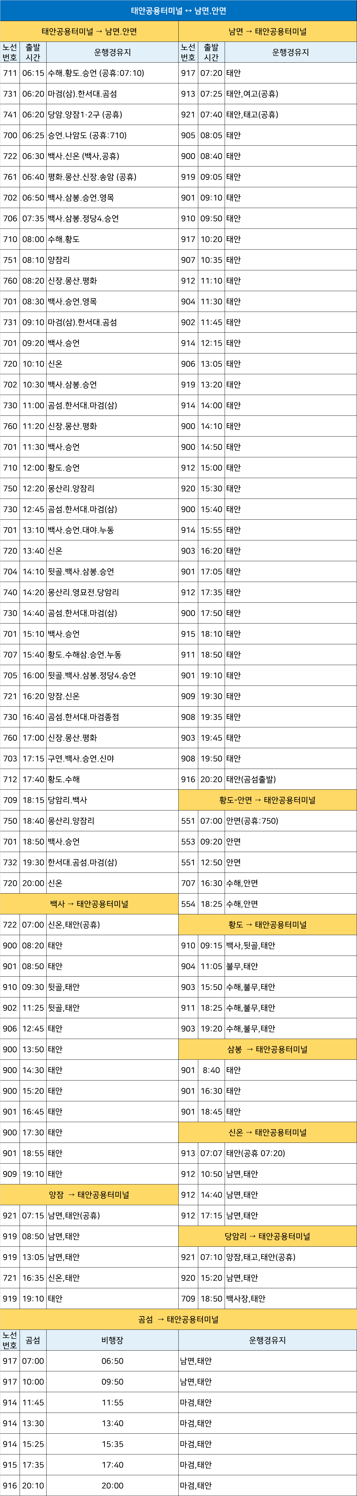 태안공용터미널 → 남면.안면, 남면 → 태안공용터미널, 황도-안면 → 태안공용터미널, 백사 → 태안공용터미널, 황도 → 태안공용터미널, 삼봉 → 태안공용터미널, 신온 → 태안공용터미널, 양잠 → 태안공용터미널, 당암리 → 태안공용터미널, 곰섬 → 태안공용터미널