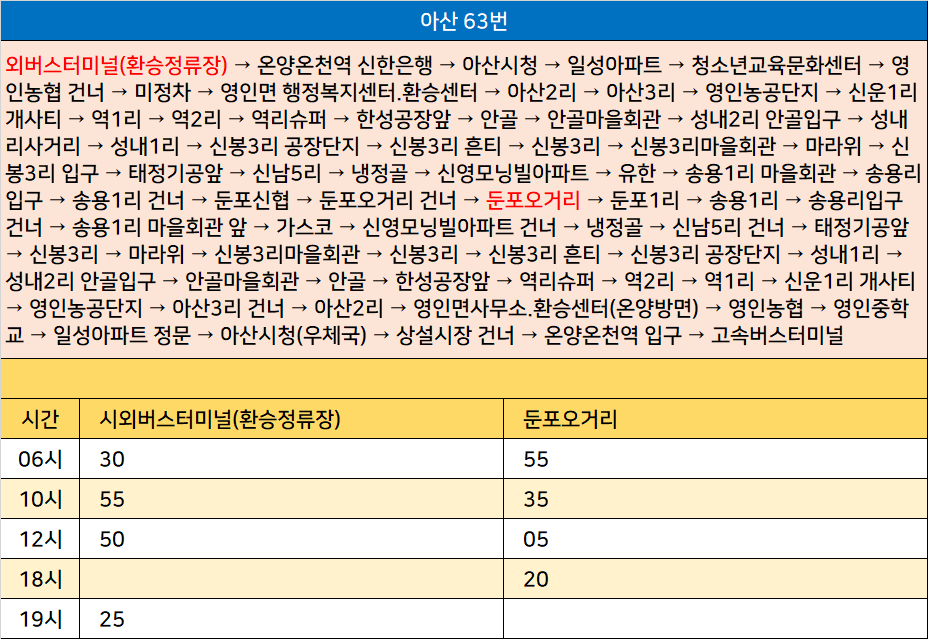 아산 63번: 시외버스터미널(환승정류장) → 온양온천역 신한은행 → 아산시청 → 일성아파트 → 청소년교육문화센터 → 영인농협 건너 → 영인면 행정복지센터.환승센터 → 아산2리 → 아산3리 → 영인농공단지 → 신운1리 개사티 → 역1리 → 역2리 → 역리슈퍼 → 한성공장앞 → 안골 → 안골마을회관 → 성내2리 안골입구 → 성내리사거리 → 성내1리 → 신봉3리 공장단지 → 신봉3리 흔티 → 신봉3리 → 신봉3리마을회관 → 마라위 → 신봉3리 입구 → 태정기공앞 → 신남5리 → 냉정골 → 신영모닝빌아파트 → 유한 → 송용1리 마을회관 → 송용리입구 → 송용1리 건너 → 둔포신협 → 둔포오거리 건너 → 둔포오거리 → 둔포1리 → 송용1리 → 송용리입구 건너 → 송용1리 마을회관 앞 → 가스코 → 신영모닝빌아파트 건너 → 냉정골 → 신남5리 건너 → 태정기공앞 → 신봉3리 → 마라위 → 신봉3리마을회관 → 신봉3리 → 신봉3리 흔티 → 신봉3리 공장단지 → 성내1리 → 성내2리 안골입구 → 안골마을회관 → 안골 → 한성공장앞 → 역리슈퍼 → 역2리 → 역1리 → 신운1리 개사티 → 영인농공단지 → 아산3리 건너 → 아산2리 → 영인면사무소.환승센터(온양방면) → 영인농협 → 영인중학교 → 일성아파트 정문 → 아산시청(우체국) → 상설시장 건너 → 온양온천역 입구 → 고속버스터미널