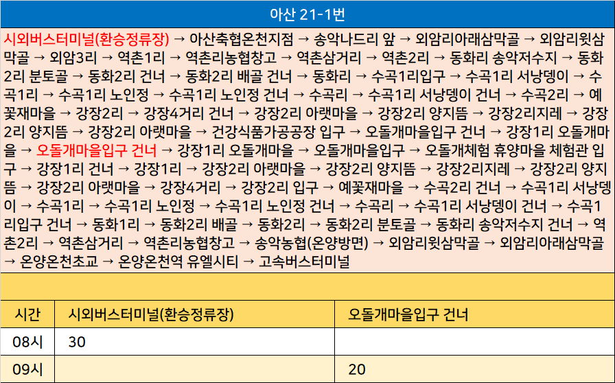 아산 21-1번: 시외버스터미널(환승정류장) → 아산축협온천지점 → 송악나드리 앞 → 외암리아래삼막골 → 외암리윗삼막골 → 외암3리 → 역촌1리 → 역촌리농협창고 → 역촌삼거리 → 역촌2리 → 동화리 송악저수지 → 동화2리 분토골 → 동화2리 건너 → 동화2리 배골 건너 → 동화리 → 수곡1리입구 → 수곡1리 서낭뎅이 → 수곡1리 → 수곡1리 노인정 → 수곡1리 노인정 건너 → 수곡리 → 수곡1리 서낭뎅이 건너 → 수곡2리 → 예꽃재마을 → 강장2리 → 강장4거리 건너 → 강장2리 아랫마을 → 강장2리 양지뜸 → 강장2리지레 → 강장2리 양지뜸 → 강장2리 아랫마을 → 건강식품가공공장 입구 → 오돌개마을입구 건너 → 강장1리 오돌개마을 → 오돌개마을입구 건너 → 강장1리 오돌개마을 → 오돌개마을입구 → 오돌개체험 휴양마을 체험관 입구 → 강장1리 건너 → 강장1리 → 강장2리 아랫마을 → 강장2리 양지뜸 → 강장2리지레 → 강장2리 양지뜸 → 강장2리 아랫마을 → 강장4거리 → 강장2리 입구 → 예꽃재마을 → 수곡2리 건너 → 수곡1리 서낭뎅이 → 수곡1리 → 수곡1리 노인정 → 수곡1리 노인정 건너 → 수곡리 → 수곡1리 서낭뎅이 건너 → 수곡1리입구 건너 → 동화1리 → 동화2리 배골 → 동화2리 → 동화2리 분토골 → 동화리 송악저수지 건너 → 역촌2리 → 역촌삼거리 → 역촌리농협창고 → 송악농협(온양방면) → 외암리윗삼막골 → 외암리아래삼막골 → 온양온천초교 → 온양온천역 유엘시티 → 고속버스터미널