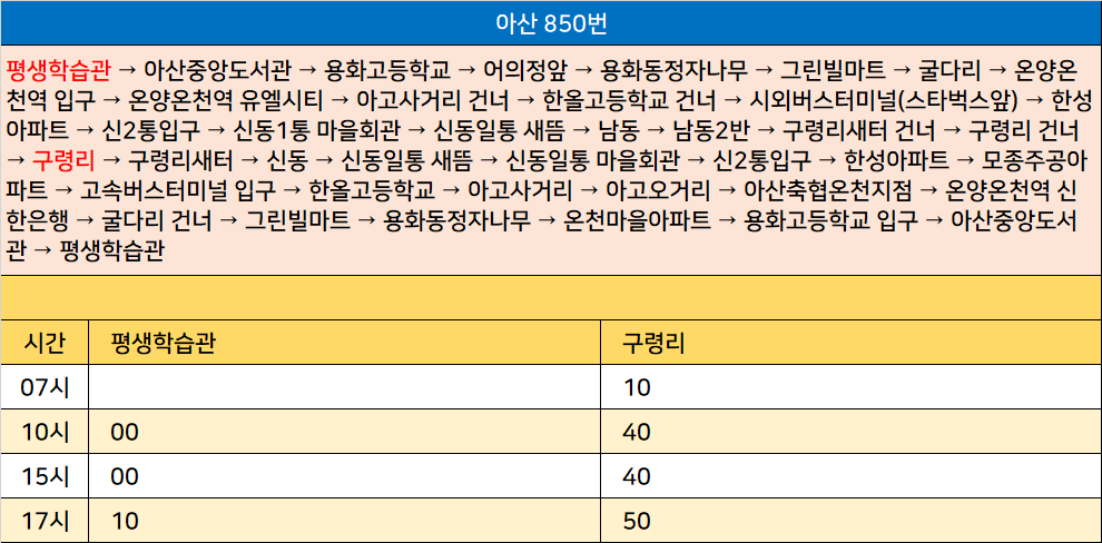 아산 850번: 평생학습관 → 아산중앙도서관 → 용화고등학교 → 어의정앞 → 용화동정자나무 → 그린빌마트 → 굴다리 → 온양온천역 입구 → 온양온천역 유엘시티 → 아고사거리 건너 → 한올고등학교 건너 → 시외버스터미널(스타벅스앞) → 한성아파트 → 신2통입구 → 신동1통 마을회관 → 신동일통 새뜸 → 남동 → 남동2반 → 구령리새터 건너 → 구령리 건너 → 구령리 → 구령리새터 → 신동 → 신동일통 새뜸 → 신동일통 마을회관 → 신2통입구 → 한성아파트 → 모종주공아파트 → 고속버스터미널 입구 → 한올고등학교 → 아고사거리 → 아고오거리 → 아산축협온천지점 → 온양온천역 신한은행 → 굴다리 건너 → 그린빌마트 → 용화동정자나무 → 온천마을아파트 → 용화고등학교 입구 → 아산중앙도서관 → 평생학습관