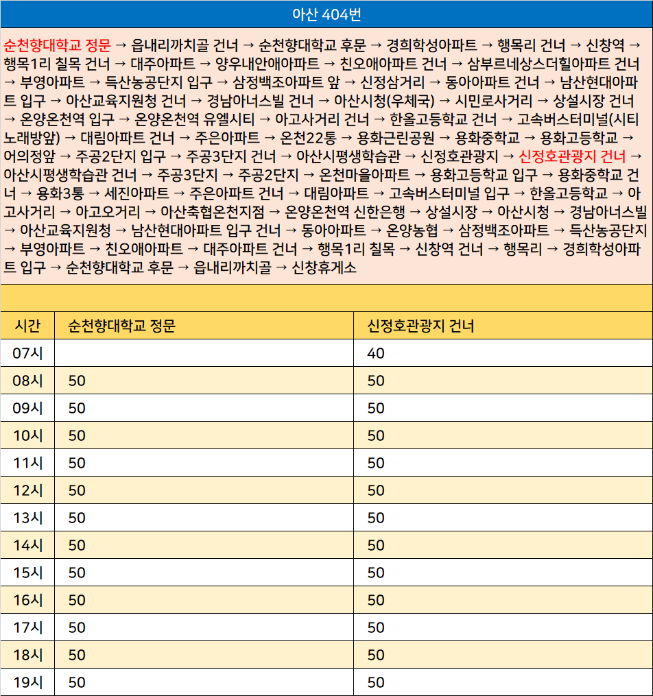 아산 404번: 순천향대학교 정문 → 읍내리까치골 건너 → 순천향대학교 후문 → 경희학성아파트 → 행목리 건너 → 신창역 → 행목1리 칠목 건너 → 대주아파트 → 양우내안애아파트 → 친오애아파트 건너 → 삼부르네상스더힐아파트 건너 → 부영아파트 → 득산농공단지 입구 → 삼정백조아파트 앞 → 신정삼거리 → 동아아파트 건너 → 남산현대아파트 입구 → 아산교육지원청 건너 → 경남아너스빌 건너 → 아산시청(우체국) → 시민로사거리 → 상설시장 건너 → 온양온천역 입구 → 온양온천역 유엘시티 → 아고사거리 건너 → 한올고등학교 건너 → 고속버스터미널(시티노래방앞) → 대림아파트 건너 → 주은아파트 → 온천22통 → 용화근린공원 → 용화중학교 → 용화고등학교 → 어의정앞 → 주공2단지 입구 → 주공3단지 건너 → 아산시평생학습관 → 신정호관광지 → 신정호관광지 건너 → 아산시평생학습관 건너 → 주공3단지 → 주공2단지 → 온천마을아파트 → 용화고등학교 입구 → 용화중학교 건너 → 용화3통 → 세진아파트 → 주은아파트 건너 → 대림아파트 → 고속버스터미널 입구 → 한올고등학교 → 아고사거리 → 아고오거리 → 아산축협온천지점 → 온양온천역 신한은행 → 상설시장 → 아산시청 → 경남아너스빌 → 아산교육지원청 → 남산현대아파트 입구 건너 → 동아아파트 → 온양농협 → 삼정백조아파트 → 득산농공단지 → 부영아파트 → 친오애아파트 → 대주아파트 건너 → 행목1리 칠목 → 신창역 건너 → 행목리 → 경희학성아파트 입구 → 순천향대학교 후문 → 읍내리까치골 → 신창휴게소