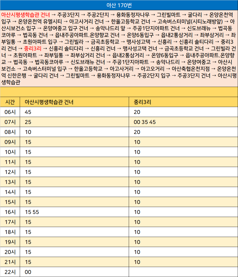 아산 170번: 아산시평생학습관 건너 → 주공3단지 → 주공2단지 → 용화동정자나무 → 그린빌마트 → 굴다리 → 온양온천역 입구 → 온양온천역 유엘시티 → 아고사거리 건너 → 한올고등학교 건너 → 고속버스터미널(시티노래방앞) → 아산시보건소 입구 → 온양여중고 입구 건너 → 송악나드리 앞 → 주공1단지아파트 건너 → 신도브래뉴 → 법곡동코아루 → 법곡동 건너 → 읍내주공아파트.온양향교 건너 → 온양6동입구 → 읍내2통삼거리 → 좌부삼거리 → 좌부일통 → 초원아파트 입구 → 그린빌라 → 금곡초등학교 → 맹사성고택 → 신흥리 → 신흥리 솔티다리 → 중리3리 건너 → 중리3리 → 신흥리 솔티다리 → 신흥리 건너 → 맹사성고택 건너 → 금곡초등학교 건너 → 그린빌라 건너 → 초원아파트 → 좌부일통 → 좌부삼거리 건너 → 읍내2통삼거리 → 온양6동입구 → 읍내주공아파트.온양향교 → 법곡동 → 법곡동코아루 → 신도브래뉴 건너 → 주공1단지아파트 → 송악나드리 → 온양여중고 → 아산시보건소 → 고속버스터미널 입구 → 한올고등학교 → 아고사거리 → 아고오거리 → 아산축협온천지점 → 온양온천역 신한은행 → 굴다리 건너 → 그린빌마트 → 용화동정자나무 → 주공2단지 입구 → 주공3단지 건너 → 아산시평생학습관