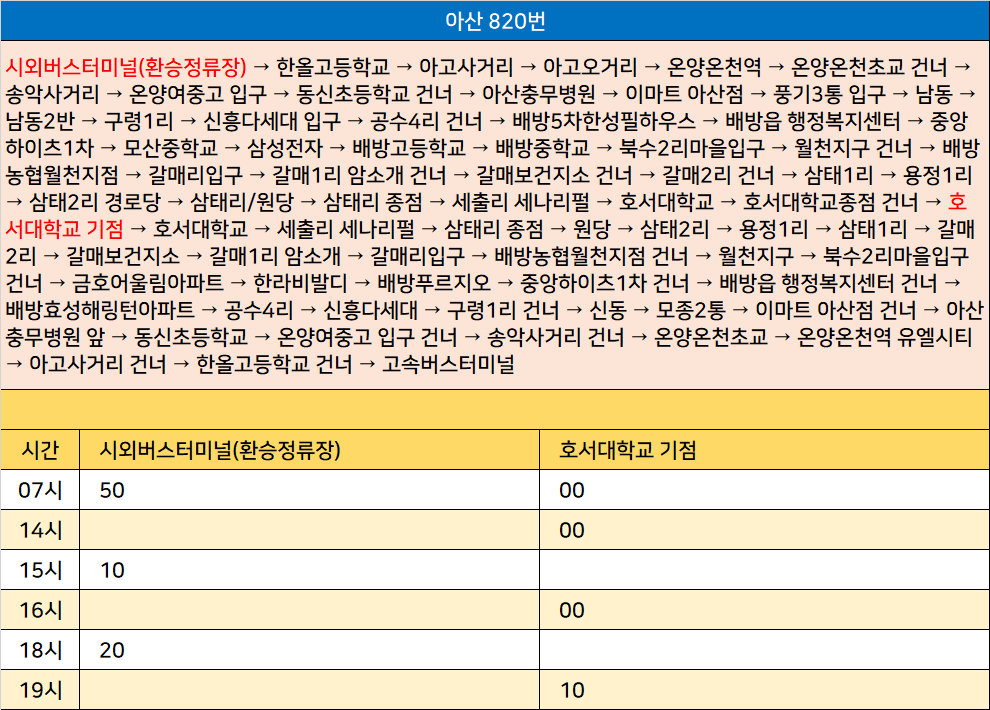 아산 820번: 시외버스터미널(환승정류장) → 한올고등학교 → 아고사거리 → 아고오거리 → 온양온천역 → 온양온천초교 건너 → 송악사거리 → 온양여중고 입구 → 동신초등학교 건너 → 아산충무병원 → 이마트 아산점 → 풍기3통 입구 → 남동 → 남동2반 → 구령1리 → 신흥다세대 입구 → 공수4리 건너 → 배방5차한성필하우스 → 배방읍 행정복지센터 → 중앙하이츠1차 → 모산중학교 → 삼성전자 → 배방고등학교 → 배방중학교 → 북수2리마을입구 → 월천지구 건너 → 배방농협월천지점 → 갈매리입구 → 갈매1리 암소개 건너 → 갈매보건지소 건너 → 갈매2리 건너 → 삼태1리 → 용정1리 → 삼태2리 경로당 → 삼태리/원당 → 삼태리 종점 → 세출리 세나리펄 → 호서대학교 → 호서대학교종점 건너 → 호서대학교 기점 → 호서대학교 → 세출리 세나리펄 → 삼태리 종점 → 원당 → 삼태2리 → 용정1리 → 삼태1리 → 갈매2리 → 갈매보건지소 → 갈매1리 암소개 → 갈매리입구 → 배방농협월천지점 건너 → 월천지구 → 북수2리마을입구 건너 → 금호어울림아파트 → 한라비발디 → 배방푸르지오 → 중앙하이츠1차 건너 → 배방읍 행정복지센터 건너 → 배방효성해링턴아파트 → 공수4리 → 신흥다세대 → 구령1리 건너 → 신동 → 모종2통 → 이마트 아산점 건너 → 아산충무병원 앞 → 동신초등학교 → 온양여중고 입구 건너 → 송악사거리 건너 → 온양온천초교 → 온양온천역 유엘시티 → 아고사거리 건너 → 한올고등학교 건너 → 고속버스터미널