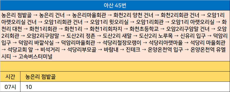 아산 45번: 농은리 점밭골 → 농은리 건너 → 농은리마을회관 → 화천2리 양천 건너 → 화천2리회관 건너 → 오암1리 아랫오리실 건너 → 오암1리회관 건너 → 오암1리 윗오리실 → 오암1리회관 → 오암1리 아랫오리실 → 화천리 대천 → 화천1리회관 → 화천1리 → 화천1리회차지 → 화천초등학교 → 오암2리구암말 건너 → 오암2리회관 → 오암2리구암말 → 도산2리 정촌 → 도산2리 새말 → 도산2리 노루목 → 신유리 입구 → 덕암리입구 → 덕암리 바깥삭실 → 덕암리마을회관 → 석당리철장모랭이 → 석당리아랫마을 → 석당리 마을회관 → 석당교회 앞 → 비석거리 → 석당리부모골 → 바람내 → 진테크 → 온양온천역 입구 → 온양온천역 유엘시티 → 고속버스터미널