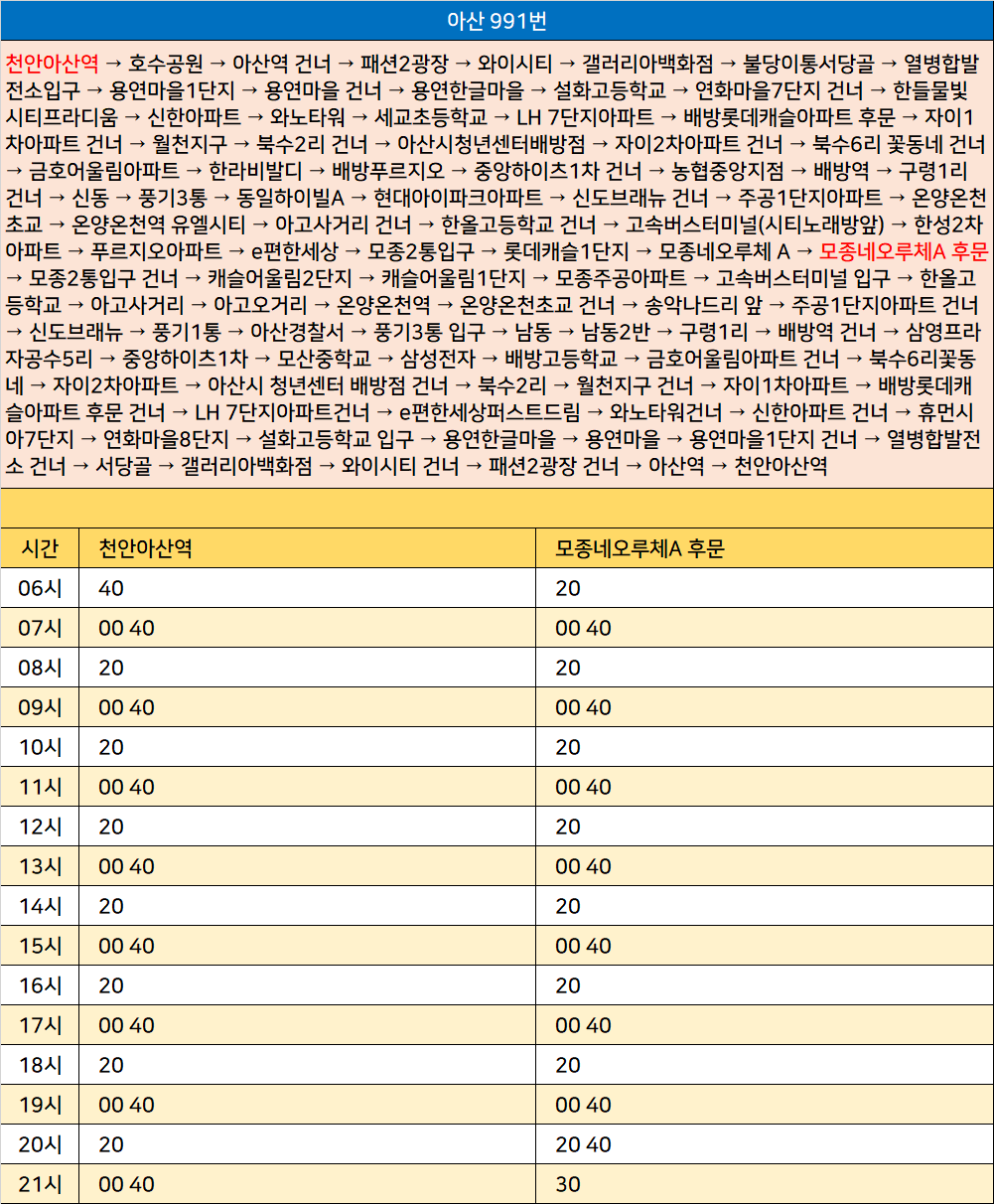 아산 991번: 천안아산역 → 호수공원 → 아산역 건너 → 패션2광장 → 와이시티 → 갤러리아백화점 → 불당이통서당골 → 열병합발전소입구 → 용연마을1단지 → 용연마을 건너 → 용연한글마을 → 설화고등학교 → 연화마을7단지 건너 → 한들물빛 시티프라디움 → 신한아파트 → 와노타워 → 세교초등학교 → LH 7단지아파트 → 배방롯데캐슬아파트 후문 → 자이1차아파트 건너 → 월천지구 → 북수2리 건너 → 아산시청년센터배방점 → 자이2차아파트 건너 → 북수6리 꽃동네 건너 → 금호어울림아파트 → 한라비발디 → 배방푸르지오 → 중앙하이츠1차 건너 → 농협중앙지점 → 배방역 → 구령1리 건너 → 신동 → 풍기3통 → 동일하이빌A → 현대아이파크아파트 → 신도브래뉴 건너 → 주공1단지아파트 → 온양온천초교 → 온양온천역 유엘시티 → 아고사거리 건너 → 한올고등학교 건너 → 고속버스터미널(시티노래방앞) → 한성2차아파트 → 푸르지오아파트 → e편한세상 → 모종2통입구 → 롯데캐슬1단지 → 모종네오루체 A → 모종네오루체A 후문 → 모종2통입구 건너 → 캐슬어울림2단지 → 캐슬어울림1단지 → 모종주공아파트 → 고속버스터미널 입구 → 한올고등학교 → 아고사거리 → 아고오거리 → 온양온천역 → 온양온천초교 건너 → 송악나드리 앞 → 주공1단지아파트 건너 → 신도브래뉴 → 풍기1통 → 아산경찰서 → 풍기3통 입구 → 남동 → 남동2반 → 구령1리 → 배방역 건너 → 삼영프라자공수5리 → 중앙하이츠1차 → 모산중학교 → 삼성전자 → 배방고등학교 → 금호어울림아파트 건너 → 북수6리꽃동네 → 자이2차아파트 → 아산시 청년센터 배방점 건너 → 북수2리 → 월천지구 건너 → 자이1차아파트 → 배방롯데캐슬아파트 후문 건너 → LH 7단지아파트건너 → e편한세상퍼스트드림 → 와노타워건너 → 신한아파트 건너 → 휴먼시아7단지 → 연화마을8단지 → 설화고등학교 입구 → 용연한글마을 → 용연마을 → 용연마을1단지 건너 → 열병합발전소 건너 → 서당골 → 갤러리아백화점 → 와이시티 건너 → 패션2광장 건너 → 아산역 → 천안아산역