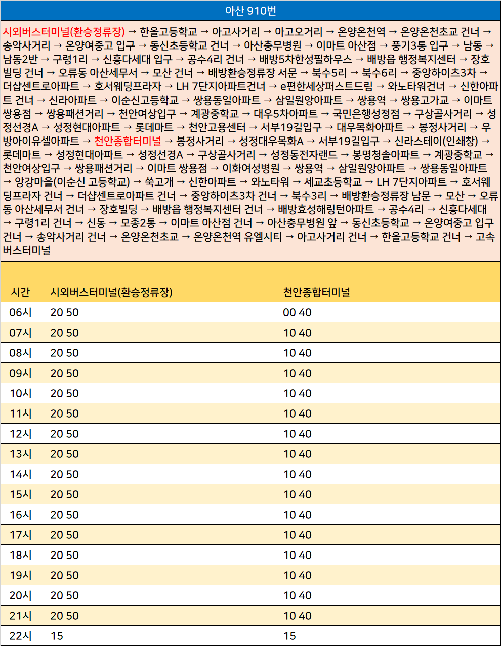 아산 910번: 시외버스터미널(환승정류장) → 한올고등학교 → 아고사거리 → 아고오거리 → 온양온천역 → 온양온천초교 건너 → 송악사거리 → 온양여중고 입구 → 동신초등학교 건너 → 아산충무병원 → 이마트 아산점 → 풍기3통 입구 → 남동 → 남동2반 → 구령1리 → 신흥다세대 입구 → 공수4리 건너 → 배방5차한성필하우스 → 배방읍 행정복지센터 → 장호빌딩 건너 → 오류동 아산세무서 → 모산 건너 → 배방환승정류장 서문 → 북수5리 → 북수6리 → 중앙하이츠3차 → 더샵센트로아파트 → 호서웨딩프라자 → LH 7단지아파트건너 → e편한세상퍼스트드림 → 와노타워건너 → 신한아파트 건너 → 신라아파트 → 이순신고등학교 → 쌍용동일아파트 → 삼일원앙아파트 → 쌍용역 → 쌍용고가교 → 이마트 쌍용점 → 쌍용패션거리 → 천안여상입구 → 계광중학교 → 대우5차아파트 → 국민은행성정점 → 구상골사거리 → 성정선경A → 성정현대아파트 → 롯데마트 → 천안고용센터 → 서부19길입구 → 대우목화아파트 → 봉정사거리 → 우방아이유셀아파트 → 천안종합터미널 → 봉정사거리 → 성정대우목화A → 서부19길입구 → 신라스테이(인쇄창) → 롯데마트 → 성정현대아파트 → 성정선경A → 구상골사거리 → 성정동전자랜드 → 봉명청솔아파트 → 계광중학교 → 천안여상입구 → 쌍용패션거리 → 이마트 쌍용점 → 이화여성병원 → 쌍용역 → 삼일원앙아파트 → 쌍용동일아파트 → 앙강마을(이순신 고등학교) → 쑥고개 → 신한아파트 → 와노타워 → 세교초등학교 → LH 7단지아파트 → 호서웨딩프라자 건너 → 더샵센트로아파트 건너 → 중앙하이츠3차 건너 → 북수3리 → 배방환승정류장 남문 → 모산 → 오류동 아산세무서 건너 → 장호빌딩 → 배방읍 행정복지센터 건너 → 배방효성해링턴아파트 → 공수4리 → 신흥다세대 → 구령1리 건너 → 신동 → 모종2통 → 이마트 아산점 건너 → 아산충무병원 앞 → 동신초등학교 → 온양여중고 입구 건너 → 송악사거리 건너 → 온양온천초교 → 온양온천역 유엘시티 → 아고사거리 건너 → 한올고등학교 건너 → 고속버스터미널