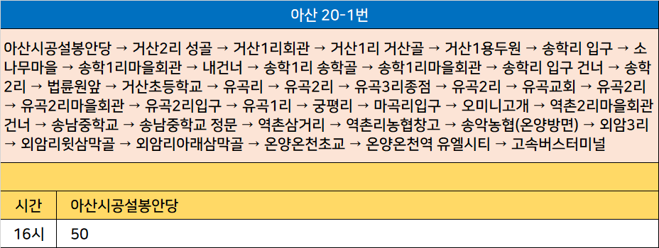 아산 20-1번: 아산시공설봉안당 → 거산2리 성골 → 거산1리회관 → 거산1리 거산골 → 거산1용두원 → 송학리 입구 → 소나무마을 → 송학1리마을회관 → 내건너 → 송학1리 송학골 → 송학1리마을회관 → 송학리 입구 건너 → 송학2리 → 법륜원앞 → 거산초등학교 → 유곡리 → 유곡2리 → 유곡3리종점 → 유곡2리 → 유곡교회 → 유곡2리 → 유곡2리마을회관 → 유곡2리입구 → 유곡1리 → 궁평리 → 마곡리입구 → 오미니고개 → 역촌2리마을회관 건너 → 송남중학교 → 송남중학교 정문 → 역촌삼거리 → 역촌리농협창고 → 송악농협(온양방면) → 외암3리 → 외암리윗삼막골 → 외암리아래삼막골 → 온양온천초교 → 온양온천역 유엘시티 → 고속버스터미널