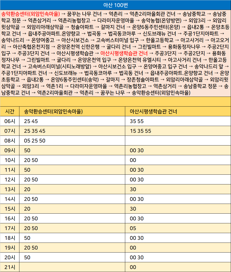 아산 100번: 송악환승센터(외암민속마을) → 꿈꾸는 나무 건너 → 역촌리 → 역촌2리마을회관 건너 → 송남중학교 → 송남중학교 정문 → 역촌삼거리 → 역촌리농협창고 → 다라미자운영마을 → 송악농협(온양방면) → 외암3리 → 외암리윗삼막골 → 외암리아래삼막골 → 청솔아파트 → 갈마지 건너 → 온양6동주민센터(온양) → 읍내2통 → 온양초등학교 건너 → 읍내주공아파트.온양향교 → 법곡동 → 법곡동코아루 → 신도브래뉴 건너 → 주공1단지아파트 → 송악나드리 → 온양여중고 → 아산시보건소 → 고속버스터미널 입구 → 한올고등학교 → 아고사거리 → 아고오거리 → 아산축협온천지점 → 온양온천역 신한은행 → 굴다리 건너 → 그린빌마트 → 용화동정자나무 → 주공2단지 입구 → 주공3단지 건너 → 아산시평생학습관 → 아산시평생학습관 건너 → 주공3단지 → 주공2단지 → 용화동정자나무 → 그린빌마트 → 굴다리 → 온양온천역 입구 → 온양온천역 유엘시티 → 아고사거리 건너 → 한올고등학교 건너 → 고속버스터미널(시티노래방앞) → 아산시보건소 입구 → 온양여중고 입구 건너 → 송악나드리 앞 → 주공1단지아파트 건너 → 신도브래뉴 → 법곡동코아루 → 법곡동 건너 → 읍내주공아파트.온양향교 건너 → 온양초등학교 → 읍내2통 → 온양6동주민센터(송악) → 갈마지 → 장존청솔아파트 → 외암리아래삼막골 → 외암리윗삼막골 → 외암3리 → 역촌1리 → 다라미자운영마을 → 역촌리농협창고 → 역촌삼거리 → 송남중학교 정문 → 송남중학교 건너 → 역촌2리마을회관 → 역촌리 → 꿈꾸는 나무 → 송악환승센터(외암민속마을)