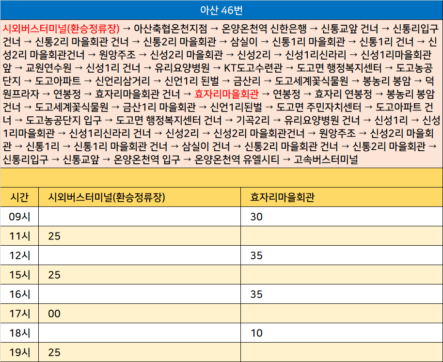 아산 46번: 시외버스터미널(환승정류장) → 아산축협온천지점 → 온양온천역 신한은행 → 신통교앞 건너 → 신통리입구 건너 → 신통2리 마을회관 건너 → 신통2리 마을회관 → 삼실이 → 신통1리 마을회관 → 신통1리 건너 → 신성2리 마을회관건너 → 원앙주조 → 신성2리 마을회관 → 신성2리 → 신성1리신라리 → 신성1리마을회관 앞 → 교원연수원 → 신성1리 건너 → 유리요양병원 → KT도고수련관 → 도고면 행정복지센터 → 도고농공단지 → 도고아파트 → 신언리삼거리 → 신언1리 된벌 → 금산리 → 도고세계꽃식물원 → 봉농리 봉암 → 덕원프라자 → 연봉정 → 효자리마을회관 건너 → 효자리마을회관 → 연봉정 → 효자리 연봉정 → 봉농리 봉암 건너 → 도고세계꽃식물원 → 금산1리 마을회관 → 신언1리된벌 → 도고면 주민자치센터 → 도고아파트 건너 → 도고농공단지 입구 → 도고면 행정복지센터 건너 → 기곡2리 → 유리요양병원 건너 → 신성1리 → 신성1리마을회관 → 신성1리신라리 건너 → 신성2리 → 신성2리 마을회관건너 → 원앙주조 → 신성2리 마을회관 → 신통1리 → 신통1리 마을회관 건너 → 삼실이 건너 → 신통2리 마을회관 건너 → 신통2리 마을회관 → 신통리입구 → 신통교앞 → 온양온천역 입구 → 온양온천역 유엘시티 → 고속버스터미널