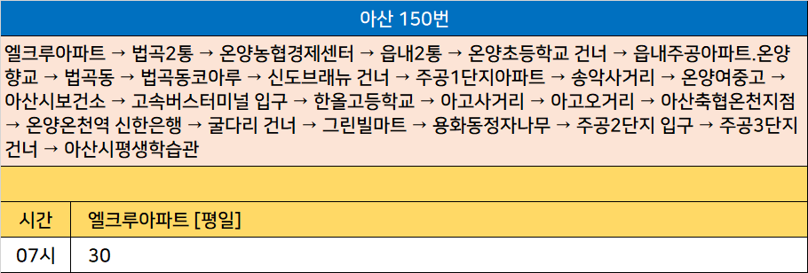 아산 150번: 엘크루아파트 → 법곡2통 → 온양농협경제센터 → 읍내2통 → 온양초등학교 건너 → 읍내주공아파트.온양향교 → 법곡동 → 법곡동코아루 → 신도브래뉴 건너 → 주공1단지아파트 → 송악사거리 → 온양여중고 → 아산시보건소 → 고속버스터미널 입구 → 한올고등학교 → 아고사거리 → 아고오거리 → 아산축협온천지점 → 온양온천역 신한은행 → 굴다리 건너 → 그린빌마트 → 용화동정자나무 → 주공2단지 입구 → 주공3단지 건너 → 아산시평생학습관