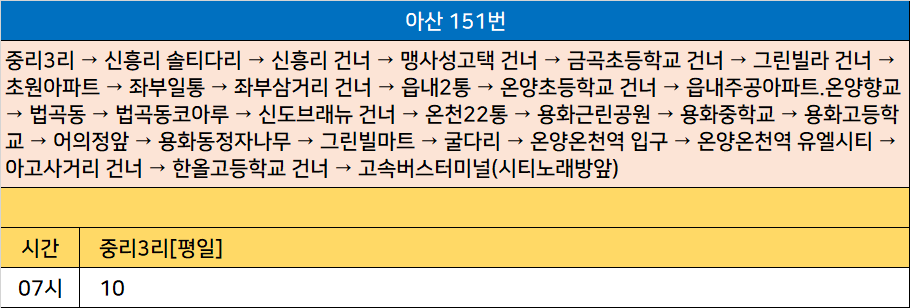 아산 151번: 중리3리 → 신흥리 솔티다리 → 신흥리 건너 → 맹사성고택 건너 → 금곡초등학교 건너 → 그린빌라 건너 → 초원아파트 → 좌부일통 → 좌부삼거리 건너 → 읍내2통 → 온양초등학교 건너 → 읍내주공아파트.온양향교 → 법곡동 → 법곡동코아루 → 신도브래뉴 건너 → 온천22통 → 용화근린공원 → 용화중학교 → 용화고등학교 → 어의정앞 → 용화동정자나무 → 그린빌마트 → 굴다리 → 온양온천역 입구 → 온양온천역 유엘시티 → 아고사거리 건너 → 한올고등학교 건너 → 고속버스터미널(시티노래방앞)