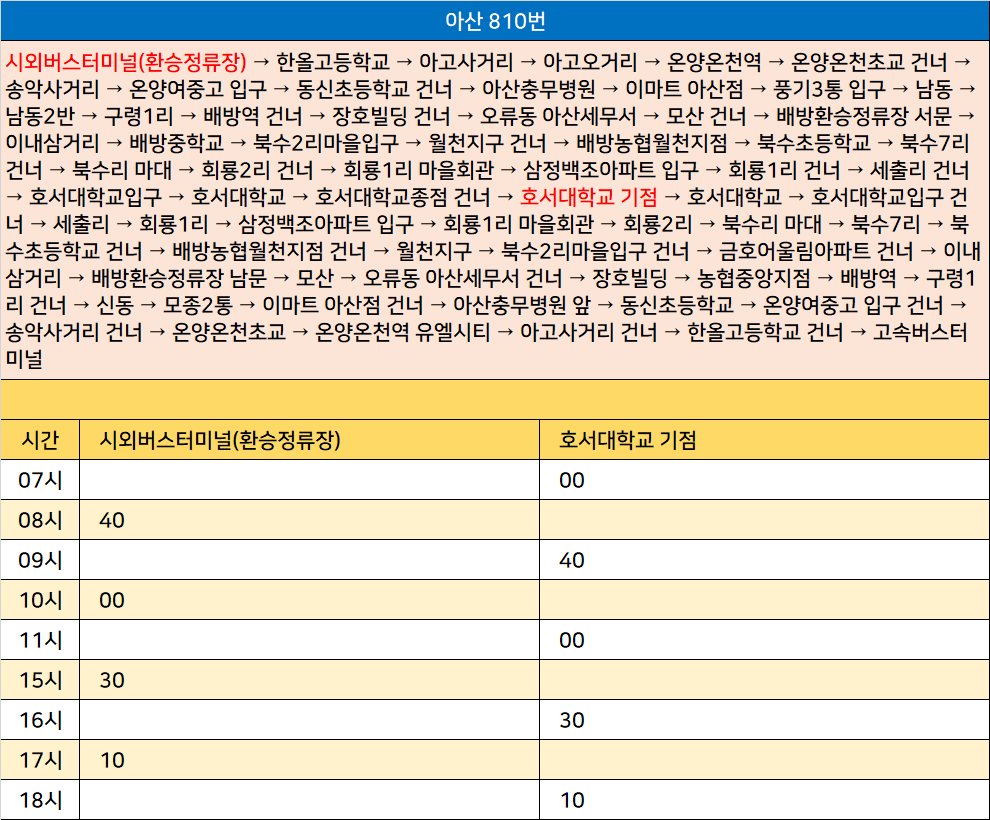 아산 810번: 시외버스터미널(환승정류장) → 한올고등학교 → 아고사거리 → 아고오거리 → 온양온천역 → 온양온천초교 건너 → 송악사거리 → 온양여중고 입구 → 동신초등학교 건너 → 아산충무병원 → 이마트 아산점 → 풍기3통 입구 → 남동 → 남동2반 → 구령1리 → 배방역 건너 → 장호빌딩 건너 → 오류동 아산세무서 → 모산 건너 → 배방환승정류장 서문 → 이내삼거리 → 배방중학교 → 북수2리마을입구 → 월천지구 건너 → 배방농협월천지점 → 북수초등학교 → 북수7리 건너 → 북수리 마대 → 회룡2리 건너 → 회룡1리 마을회관 → 삼정백조아파트 입구 → 회룡1리 건너 → 세출리 건너 → 호서대학교입구 → 호서대학교 → 호서대학교종점 건너 → 호서대학교 기점 → 호서대학교 → 호서대학교입구 건너 → 세출리 → 회룡1리 → 삼정백조아파트 입구 → 회룡1리 마을회관 → 회룡2리 → 북수리 마대 → 북수7리 → 북수초등학교 건너 → 배방농협월천지점 건너 → 월천지구 → 북수2리마을입구 건너 → 금호어울림아파트 건너 → 이내삼거리 → 배방환승정류장 남문 → 모산 → 오류동 아산세무서 건너 → 장호빌딩 → 농협중앙지점 → 배방역 → 구령1리 건너 → 신동 → 모종2통 → 이마트 아산점 건너 → 아산충무병원 앞 → 동신초등학교 → 온양여중고 입구 건너 → 송악사거리 건너 → 온양온천초교 → 온양온천역 유엘시티 → 아고사거리 건너 → 한올고등학교 건너 → 고속버스터미널