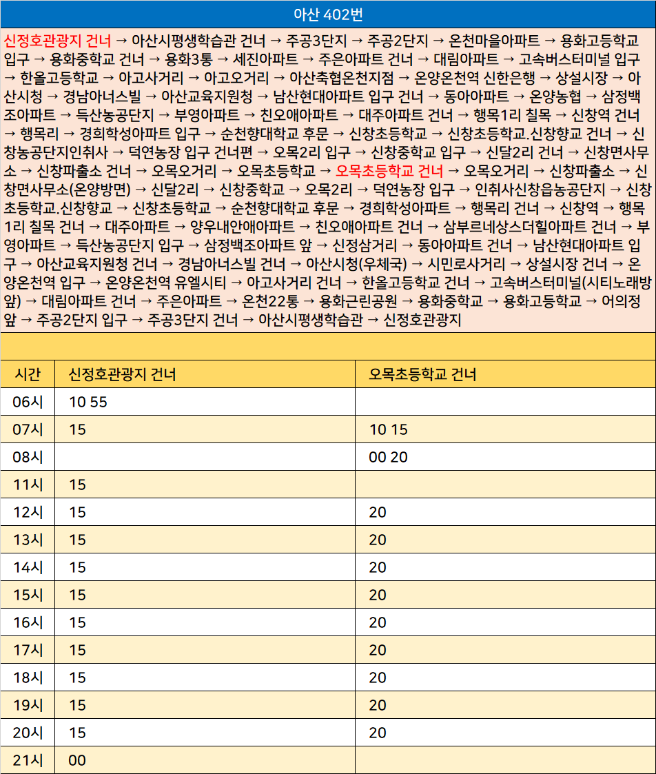 아산 402번: 신정호관광지 건너 → 아산시평생학습관 건너 → 주공3단지 → 주공2단지 → 온천마을아파트 → 용화고등학교 입구 → 용화중학교 건너 → 용화3통 → 세진아파트 → 주은아파트 건너 → 대림아파트 → 고속버스터미널 입구 → 한올고등학교 → 아고사거리 → 아고오거리 → 아산축협온천지점 → 온양온천역 신한은행 → 상설시장 → 아산시청 → 경남아너스빌 → 아산교육지원청 → 남산현대아파트 입구 건너 → 동아아파트 → 온양농협 → 삼정백조아파트 → 득산농공단지 → 부영아파트 → 친오애아파트 → 대주아파트 건너 → 행목1리 칠목 → 신창역 건너 → 행목리 → 경희학성아파트 입구 → 순천향대학교 후문 → 신창초등학교 → 신창초등학교.신창향교 건너 → 신창농공단지인취사 → 덕연농장 입구 건너편 → 오목2리 입구 → 신창중학교 입구 → 신달2리 건너 → 신창면사무소 → 신창파출소 건너 → 오목오거리 → 오목초등학교 → 오목초등학교 건너 → 오목오거리 → 신창파출소 → 신창면사무소(온양방면) → 신달2리 → 신창중학교 → 오목2리 → 덕연농장 입구 → 인취사신창읍농공단지 → 신창초등학교.신창향교 → 신창초등학교 → 순천향대학교 후문 → 경희학성아파트 → 행목리 건너 → 신창역 → 행목1리 칠목 건너 → 대주아파트 → 양우내안애아파트 → 친오애아파트 건너 → 삼부르네상스더힐아파트 건너 → 부영아파트 → 득산농공단지 입구 → 삼정백조아파트 앞 → 신정삼거리 → 동아아파트 건너 → 남산현대아파트 입구 → 아산교육지원청 건너 → 경남아너스빌 건너 → 아산시청(우체국) → 시민로사거리 → 상설시장 건너 → 온양온천역 입구 → 온양온천역 유엘시티 → 아고사거리 건너 → 한올고등학교 건너 → 고속버스터미널(시티노래방앞) → 대림아파트 건너 → 주은아파트 → 온천22통 → 용화근린공원 → 용화중학교 → 용화고등학교 → 어의정앞 → 주공2단지 입구 → 주공3단지 건너 → 아산시평생학습관 → 신정호관광지
