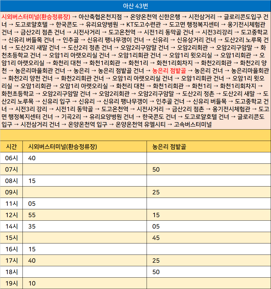아산 43번: 시외버스터미널(환승정류장) → 아산축협온천지점 → 온양온천역 신한은행 → 시전삼거리 → 글로리콘도입구 건너 → 도고로얄호텔 → 한국콘도 → 유리요양병원 → KT도고수련관 → 도고면 행정복지센터 → 옹기전시체험관 건너 → 금산2리 점촌 건너 → 시전사거리 → 도고온천역 → 시전1리 동막골 건너 → 시전3리강리 → 도고중학교 → 신유리 버들목 건너 → 인추골 → 신유리 팽나무갱이 건너 → 신유리 → 신유삼거리 건너 → 도산2리 노루목 건너 → 도산2리 새말 건너 → 도산2리 정촌 건너 → 오암2리구암말 건너 → 오암2리회관 → 오암2리구암말 → 화천초등학교 건너 → 오암1리 아랫오리실 건너 → 오암1리회관 건너 → 오암1리 윗오리실 → 오암1리회관 → 오암1리 아랫오리실 → 화천리 대천 → 화천1리회관 → 화천1리 → 화천1리회차지 → 화천2리회관 → 화천2리 양천 → 농은리마을회관 건너 → 농은리 → 농은리 점밭골 건너 → 농은리 점밭골 → 농은리 건너 → 농은리마을회관 → 화천2리 양천 건너 → 화천2리회관 건너 → 오암1리 아랫오리실 건너 → 오암1리회관 건너 → 오암1리 윗오리실 → 오암1리회관 → 오암1리 아랫오리실 → 화천리 대천 → 화천1리회관 → 화천1리 → 화천1리회차지 → 화천초등학교 → 오암2리구암말 건너 → 오암2리회관 → 오암2리구암말 → 도산2리 정촌 → 도산2리 새말 → 도산2리 노루목 → 신유리 입구 → 신유리 → 신유리 팽나무갱이 → 인추골 건너 → 신유리 버들목 → 도고중학교 건너 → 시전3리 강리 → 시전1리 동막골 → 도고온천역 → 시전사거리 → 금산2리 점촌 → 옹기전시체험관 → 도고면 행정복지센터 건너 → 기곡2리 → 유리요양병원 건너 → 한국콘도 건너 → 도고로얄호텔 건너 → 글로리콘도입구 → 시전삼거리 건너 → 온양온천역 입구 → 온양온천역 유엘시티 → 고속버스터미널