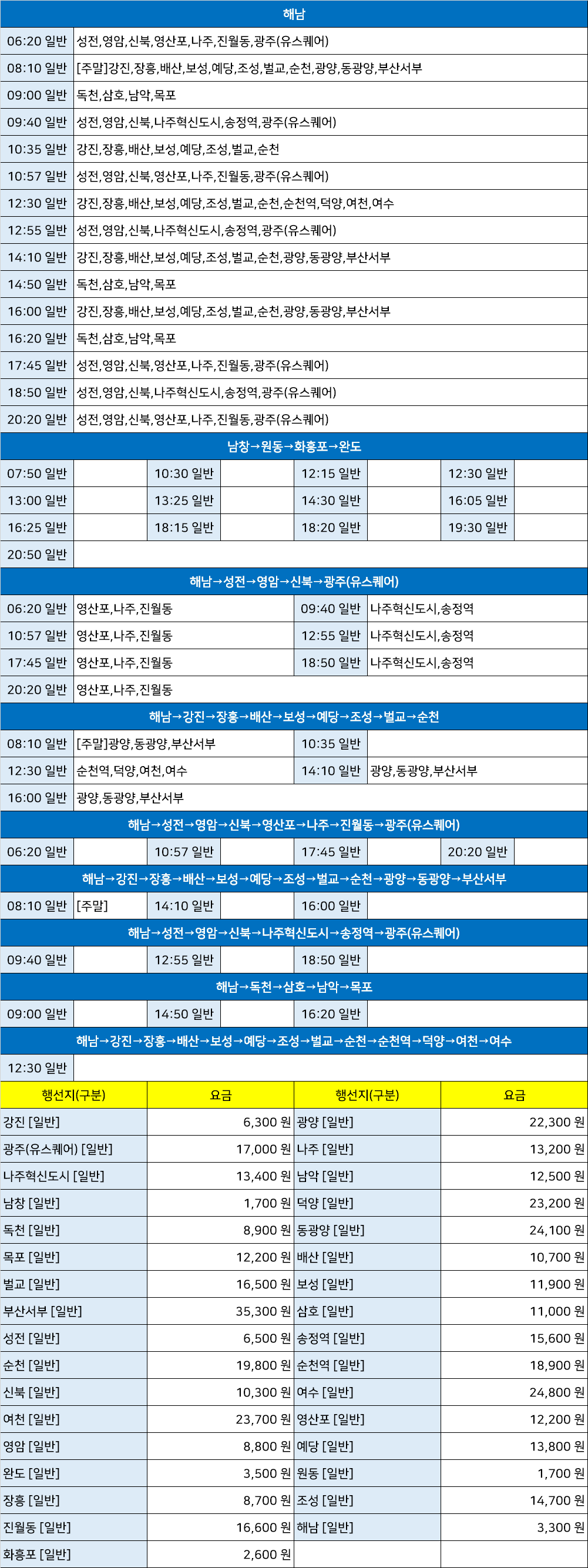월송자동차여객시외고속터미널 월송정류소 월송정류장 월송터미널 → "남창→원동→화흥포→완도,해남→강진→장흥→배산→보성→예당→조성→벌교→순천→광양→동광양→부산서부,해남→강진→장흥→배산→보성→예당→조성→벌교→순천→순천역→덕양→여천→여수,해남→독천→삼호→남악→목포,해남→성전→영암→신북→광주(유스퀘어),해남→성전→영암→신북→나주혁신도시→송정역→광주(유스퀘어),해남→성전→영암→신북→영산포→나주→진월동→광주(유스퀘어)".