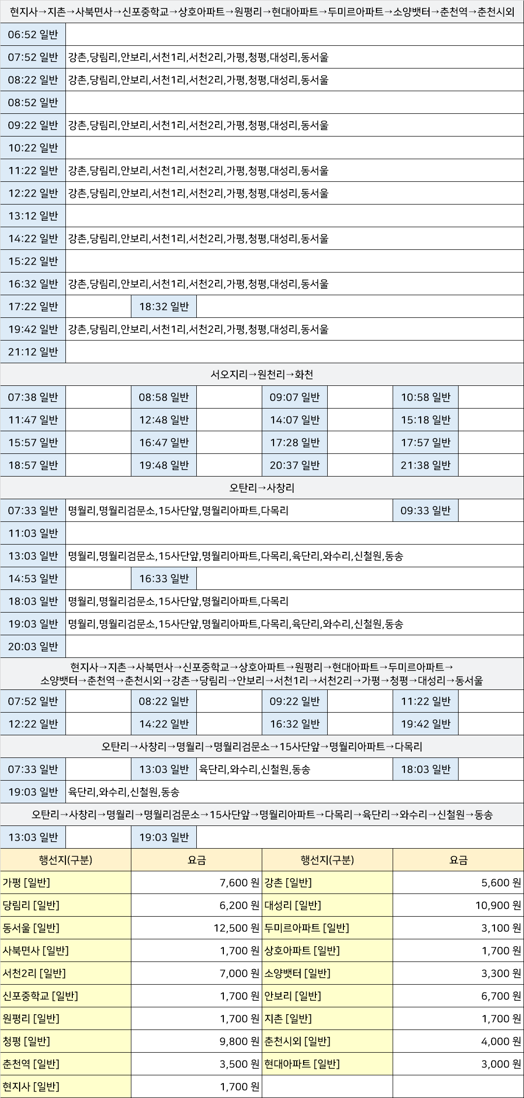 어리고개시외고속버스터미널 어리고개정류장 어리고개정류소 → "서오지리→원천리→화천,오탄리→사창리→명월리→명월리검문소→15사단앞→명월리아파트→다목리→육단리→와수리→신철원→동송,현지사→지촌→사북면사→신포중학교→상호아파트→원평리→현대아파트→두미르아파트→소양뱃터→춘천역→춘천시외→강촌→당림리→안보리→서천1리→서천2리→가평→청평→대성리→동서울".