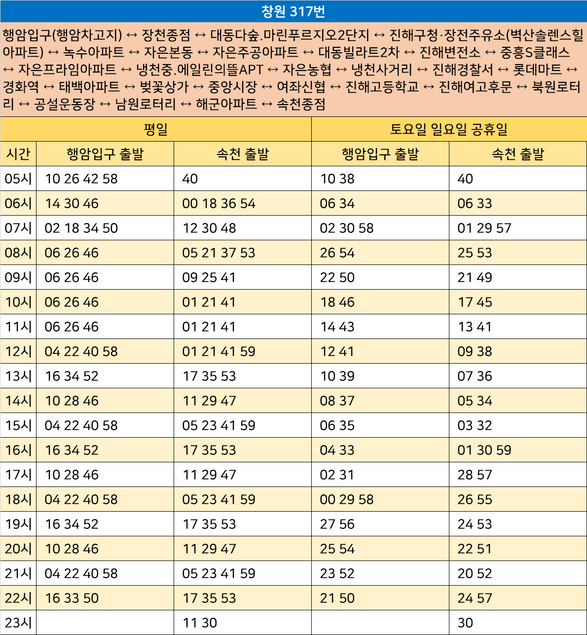 창원 317번: 행암입구(행암차고지) ↔ 장천종점 ↔ 대동다숲.마린푸르지오2단지 ↔ 진해구청·장전주유소(벽산솔렌스힐아파트) ↔ 녹수아파트 ↔ 자은본동 ↔ 자은주공아파트 ↔ 대동빌라트2차 ↔ 진해변전소 ↔ 중흥S클래스 ↔ 자은프라임아파트 ↔ 냉천중.에일린의뜰APT ↔ 자은농협 ↔ 냉천사거리 ↔ 진해경찰서 ↔ 롯데마트 ↔ 경화역 ↔ 태백아파트 ↔ 벚꽃상가 ↔ 중앙시장 ↔ 여좌신협 ↔ 진해고등학교 ↔ 진해여고후문 ↔ 북원로터리 ↔ 공설운동장 ↔ 남원로터리 ↔ 해군아파트 ↔ 속천종점
